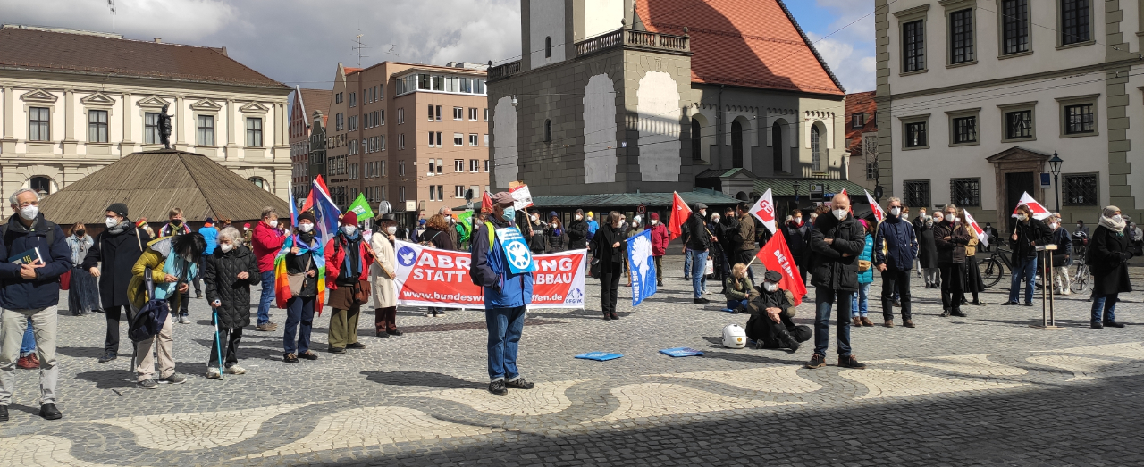 Impressionen vom Ostermarsch 2021 auf dem Augsburger Rathausplatz gibt dieses Video auf Youtube.