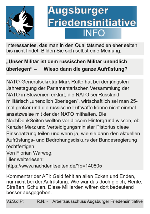 NATO-Generalsekretär Mark Rutte hat bei der jüngsten Jahrestagung der Parlamentarischen Versammlung der NATO in Slowenien erklärt, die NATO sei Russland militärisch „unendlich überlegen“, wirtschaftlich sei man 25mal größer und die russische Luftwaffe könne nicht einmal ansatzweise mit der der NATO mithalten. Die NachDenkSeiten wollten vor diesem Hintergrund wissen, ob Kanzler Merz und Verteidigungsminister Pistorius diese Einschätzung teilen und wenn ja, wie sie dann den aktuellen Aufrüstungs- und Bedrohungsdiskurs der Bundesregierung rechtfertigen.