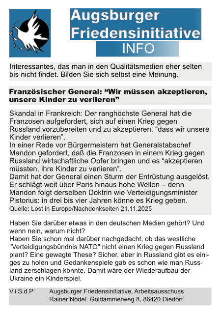 Die Gruppe Augsburg für Palästina führt jeden zweiten Montag auf dem Königsplatz in Augsburg eine Mahnwache durch. Beginn ist um 17 Uhr. Die AFI unterstützt diese Aktionen und ruft zur Teilnahme auf. Die Bombardements und Angriffe der israelischen Armee in Gaza lassen die Zahl der Toten stündlich steigen. Auch die noch lebenden israelischen Geiseln, deren Freilassung wir fordern, sind dadurch bedroht. Gleichzeitigsterben Menschen durch das gezielte Aushungern, das nach Meinung vieler Experten neben den Angriffen den Tatbestand eines Genozids erfüllt. Wir von der AFI fordern gemeinsam mit Augsburg für Palästina von der israelischen Regierung einen sofortigen Waffenstillstand und dass die Versorgung der Menschen in Gaza durch die UN ohne Einschränkungen zugelassen wird. Von der Bundesregierung fordern wir einen sofortigen Stopp der Exporte von Waffen und Rüstungsgütern nach Israel und ein Ende der Unterstützung der dortigen Regierung.