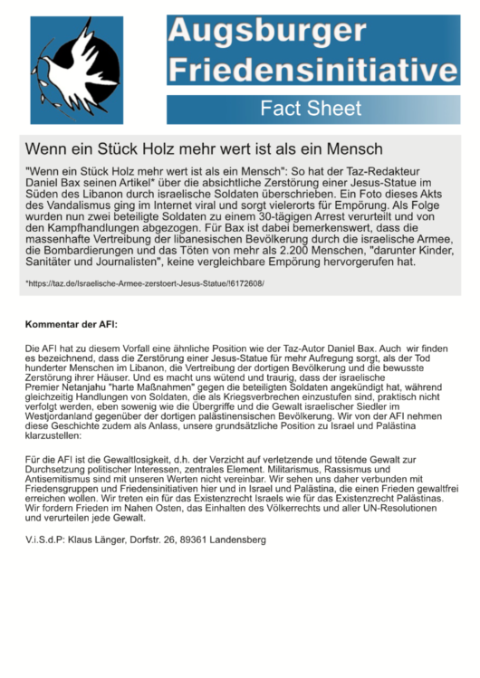Die AFI hat zu diesem Vorfall eine ähnliche Position wie der Taz-Autor Daniel Bax. Auch wir finden es bezeichnend, dass die Zerstörung einer Jesus-Statue für mehr Aufregung sorgt als der Tod hunderter Menschen im Libanon, die Vertreibung der dortigen Bevölkerung und die bewusste Zerstörung ihrer Häuser. Und es macht uns wütend und traurig, dass der israelische Premier Netanjahu "harte Maßnahmen" gegen die beteiligten Soldaten angekündigt hat, während gleichzeitig Handlungen von Soldaten, die als Kriegsverbrechen einzustufen sind, praktisch nicht verfolgt werden, ebenso wenig wie die Übergriffe und die Gewalt israelischer Siedler im Westjordanland gegenüber der dortigen palästinensischen Bevölkerung. Wir von der AFI nehmen diese Geschichte zudem als Anlass, unsere grundsätzliche Position zu Israel und Palästina klarzustellen: